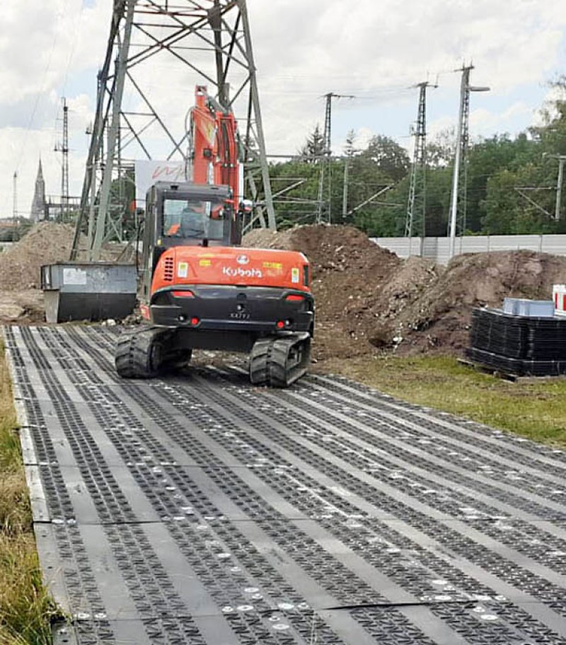 Die von Hand verlegbare Schwerlastmatte hält auch höchsten Belastungen (130 t.) stand. Das neuartig designte Profil mit genormten Spurrinnen eignet sich zum Überfahren mit Hubwagen oder Schubkarre, als auch zur Schwerlastnutzung von Kettenfahrzeugen und schweren Baumaschinen.